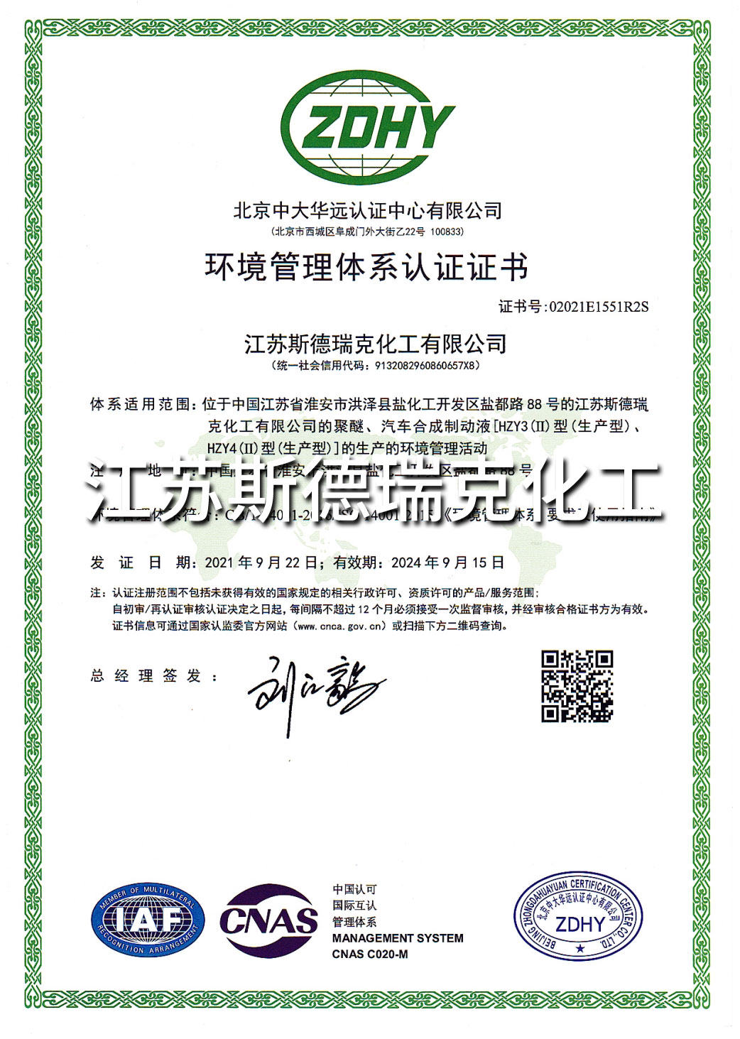 江蘇斯德瑞克化工有限公司成立于2002年,是一家集研發、生產和銷售一體化的“國家高新技術企業”。現有員工100多人,其中科技人員占20%以上;位于江蘇省淮安市鹽化工園,占地面積180畝,建筑面積達38000多平方米。